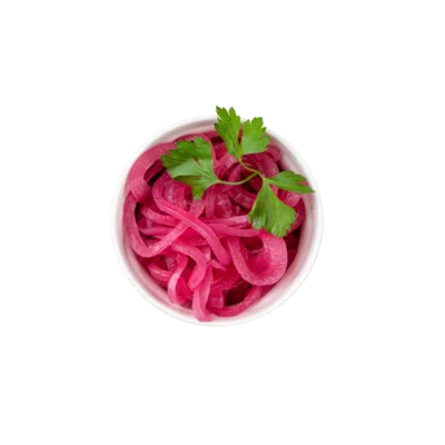 6. Déposez un peu du mélange tomates-fraises sur chaque morceau de ciabatta et terminez avec les oignons pickles et les feuilles de basilic.